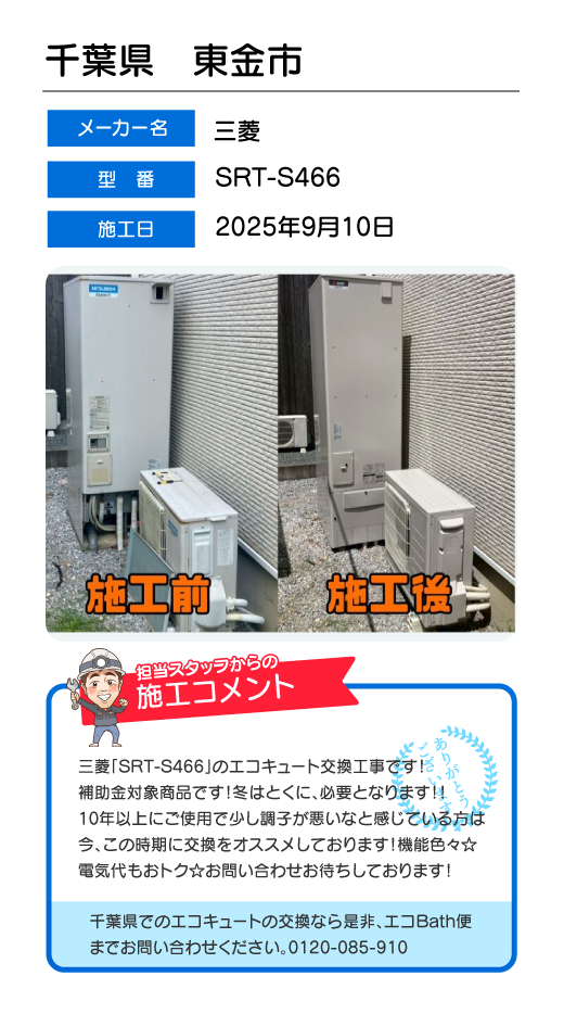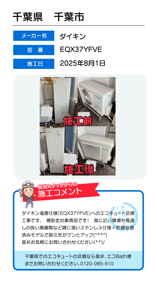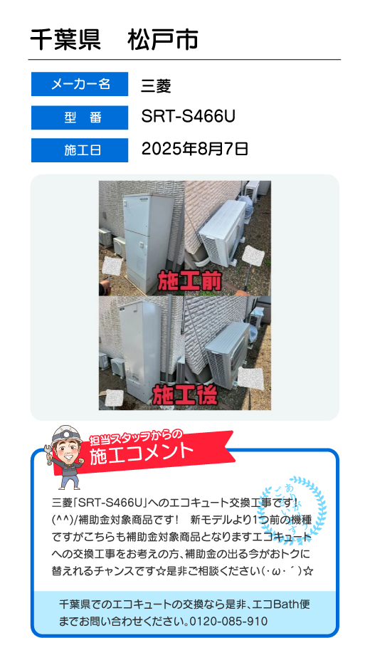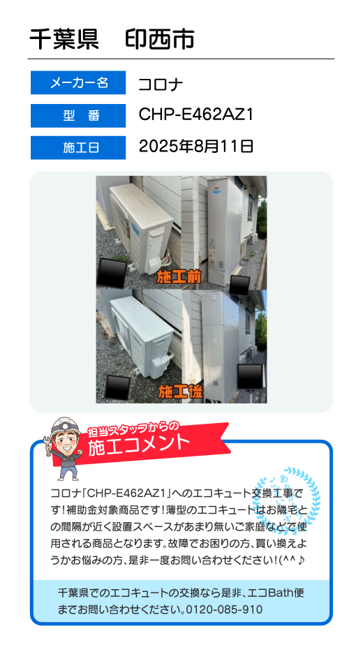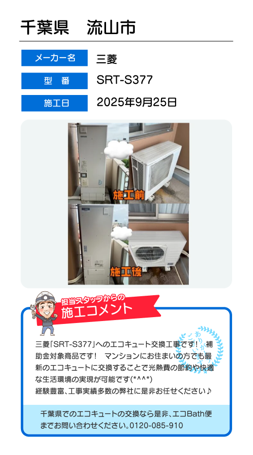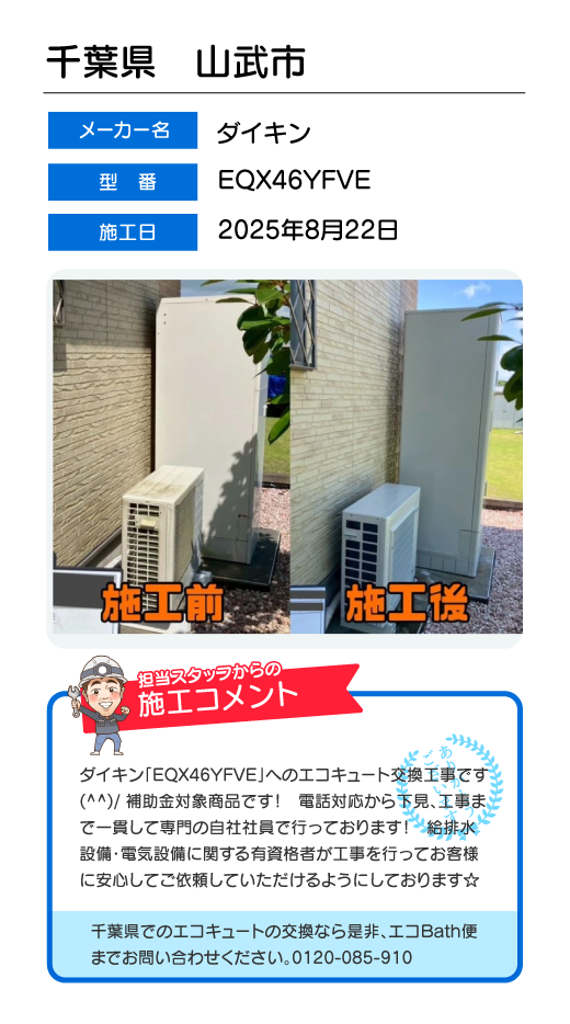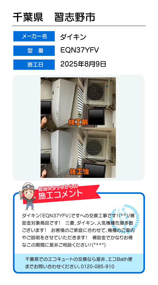 関東一円(東京/千葉/埼玉/神奈川/群馬/栃木/茨城)でのエコキュート工事はお任せ下さい!エコBath便(エコバス便)はエコキュート交換専門です。日曜・祝日にも対応!急ぎの翌日スピード工事もお任せ下さい。たくさんのエコキュート工事の実例をご紹介します。